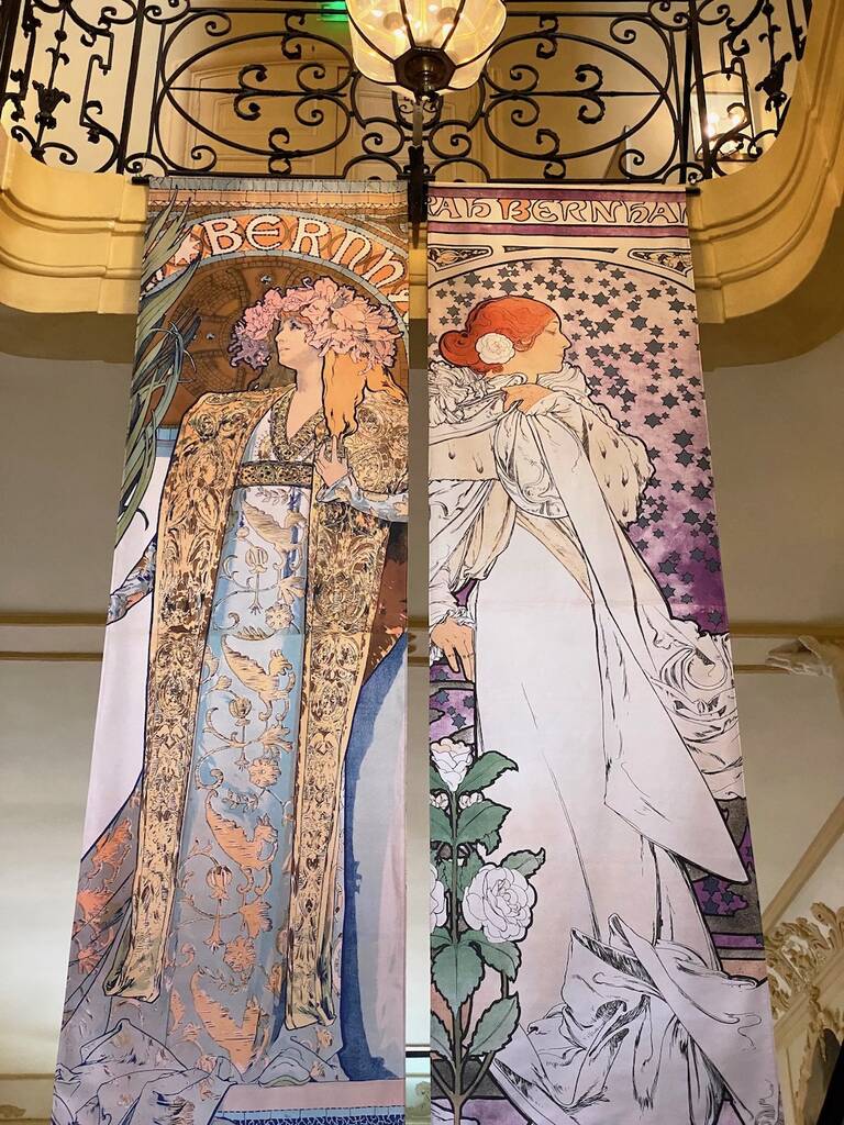 Fin décembre 1894, Alphonse Mucha conçoit sa première affiche pour Sarah Bernhardt, Gismonda qui lui commandera ultérieurement les affiches de ses spectacles suivants. Cette rencontre providentielle le fera connaître du Tout Paris. Marcus Mucha, son arrière petit-fils raconte : «Sarah Bernhardt, qui était une des actrices les plus célèbres au monde, comparable à Nicole Kidman ou Angelina Jolie aujourd’hui, jouait dans une nouvelle pièce, Gismonda, qui ne marchait pas très bien au box-office. Estimant que cela était dû à la publicité, elle a demandé à son imprimeur de commander une nouvelle affiche pour la pièce. Mais comme c’était juste un peu avant Noël, la plupart des artistes auxquels il aurait pu s’adresser étaient absents pour les fêtes. N’ayant pas d’autre choix, il a été contraint de s’adresser à un artiste tchèque peu connu, Alphonse Mucha, qui se trouvait en ville et travaillait. L’artiste a imaginé une lithographie que l’imprimeur a trouvée horrible Cependant, n’ayant rien d’autre à proposer à la comédienne, l’imprimeur l’a envoyée à Sarah Bernhardt qui la trouvée géniale. Par la suite, elle lui déclara: « Monsieur Mucha, vous m’avez rendue immortelle. » L’affiche eut un tel impact que Sarah Bernhardt a signa un contrat de six ans avec Mucha pour concevoir ses affiches, ses décors et ses costumes. Il devint, en quelque sorte son directeur artistique et Alphonse connut alors un succès qui dépassait de loin tout ce dont il avait osé rêver lorsqu’il s’est engagé sur la voie de l’art.»