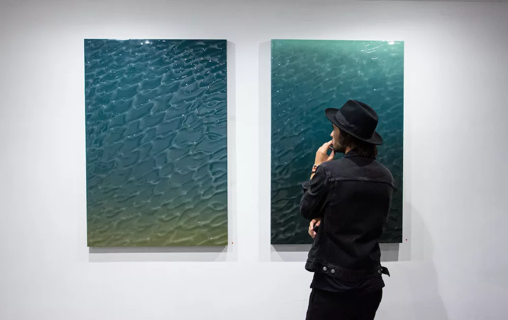 D.E. : Ce sera le peintre Jan Kuhlemeier. Le vernissage aura lieu le 14 mars prochain. Son Exposition s’appellera Sama Sama. Ce qui signifie «You are welcome» en indonésien. Les œuvres qui seront présentées ont toutes été produites pendant un périple qu’il a effectué pendant une année à travers le monde. Celà me tenait particulièrement à cœur de commencer par lui. Il est hollandais et passionné de surf. Il travaille sur la lumière, la translucidité, la transparence de la mer. Il utilise pour ce faire un gel de sa composition avec des pigments.