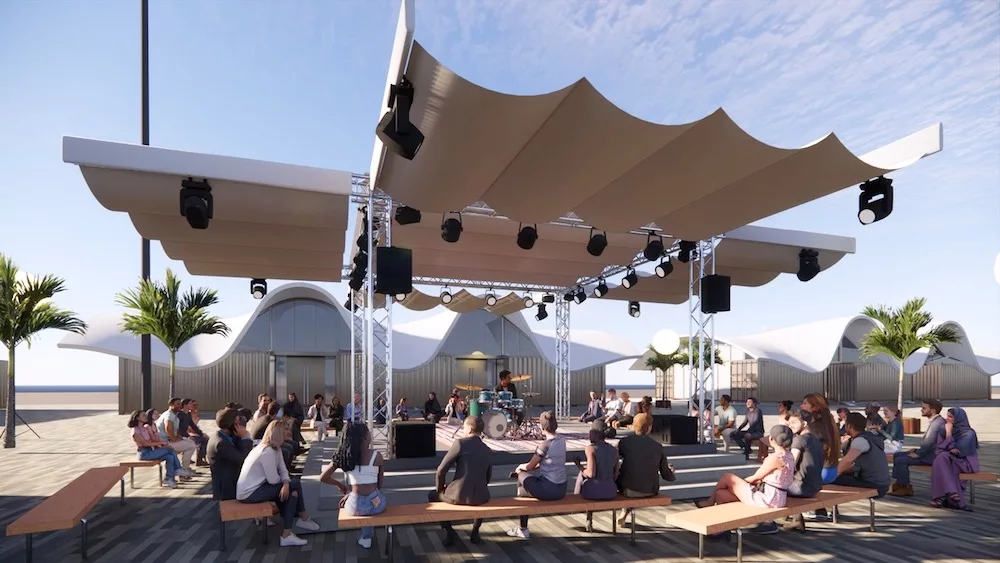 Côté terre, le village avec ses pavillons d’exposition a été imaginé par Jean-Michel Vilmotte. Ce village à ciel ouvert pourra accueillir plusieurs milliers de visiteurs par jour. Il battra pavillon français et dès 2027 fera le tour du monde toujours dans l’esprit de démocratiser la Culture.