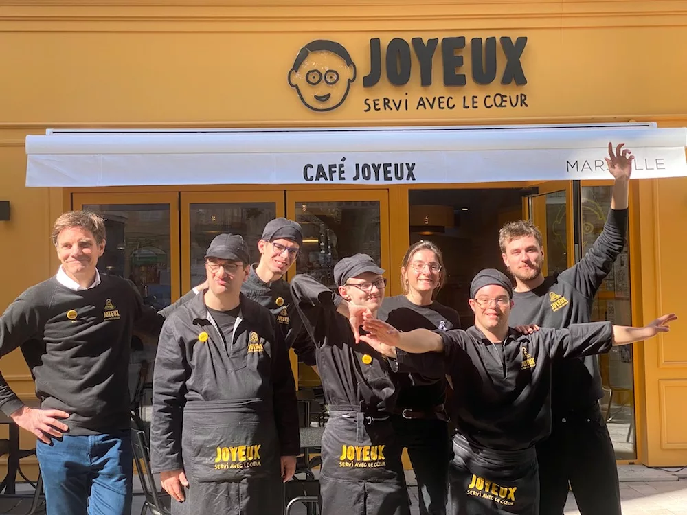 Les Cafés Joyeux sont des cafés-restaurants qui emploient et forment des personnes avec handicap mental ou cognitif. Ce sont des personnes neuro atypiques qui ne sont pas recrutées sur leurs compétences mais sur leurs motivations et leur désir de progresser.