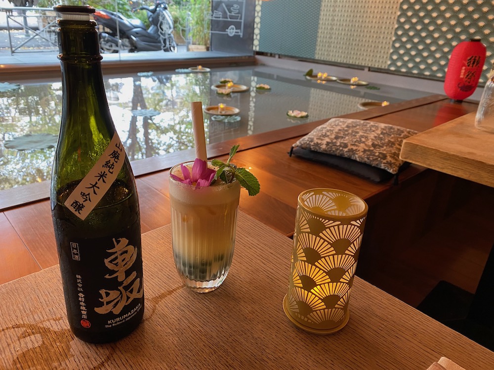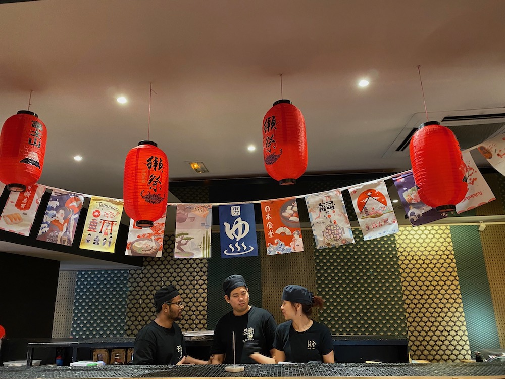 À l’entrée du restaurant, se trouve le carré Izakaya. En face un bar en mosaïque pour découvrir les différents cocktails et alcools emblématiques du Japon. Certaines des spécialités sont préparées devant les convives sur le fameux Teppanyaki, une grande plaque chauffante japonaise, située à côté du bar.