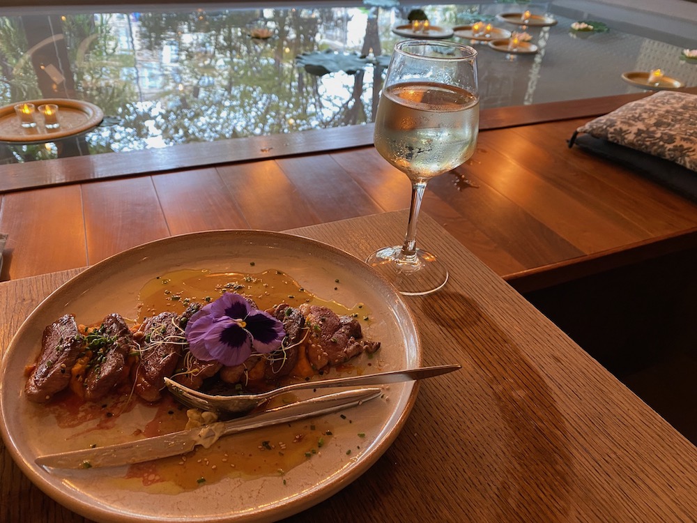 C’est un véritable enchantement pour les papilles des gourmets les plus exigeants, dans le magnifique écrin qu’a constitué la nouvelle équipe, qui a repris le lieu il y a 3 ans. Les teintes vert d’eau et or se reflètent dans le bassin inspiré des bassins japonais. C’est un véritable dépaysement et un moment de détente absolue. Le décor est feutré, la lumière tamisée et le restaurant accueille dans une ambiance zen de grandes tablées d’une dizaine de personnes ou de plus petites tables pour des repas romantiques au bord du bassin.